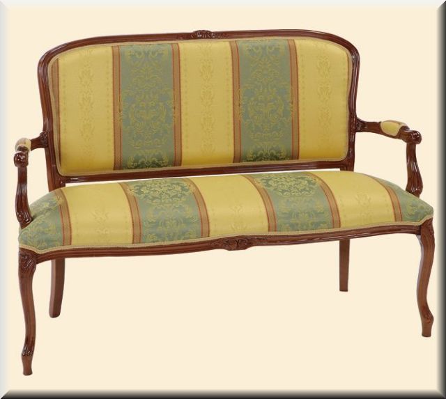 イタリア製 サロンアームソファ クラッシック ジャガードグリーン系 艶やかなフレームにグリーンとイエロー系のファブリックがマッチしており、高級感がございます。ゆったりとした空間を演出できます。素敵なクラッシックラブソファです。 サイズ W120cm D56cm H88cm SH46cmになります。 こちらの商品は送料無料です。直送となりますので、代引きはご利用いただけません。