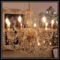 上品でエレガントなデザイン。クリスタルパーツを多数使用した当店オリジナルのシャンデリアです。 トップからアームにかけての流れるラインとボトムからアームをつないだラインに特徴を持たせました。