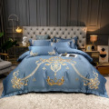 光沢のある上品カラー。ゴールド系の大胆な刺繍が素敵な寝具です。カバーの表面はサテン生地で裏面とシーツは綿素材。美しい仕上がりのセットです。