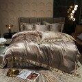 光沢のある上品カラー。カバーの表面はサテン生地。大胆な柄とトリムエッジがおしゃれなカバーセット。カバー裏面とシーツは綿素材です。美しい仕上がりのお品です。