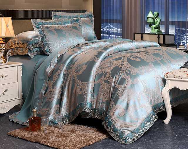 光沢のある綺麗なカラー。ダマスク模様の素敵なジャガード織りです。カバーのエッジにレースをあしらった美しい仕上がりのセットです。