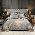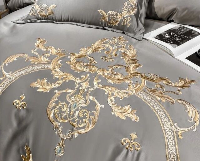 光沢のある上品なカラー。ゴールド系の大胆な刺繍が素敵な寝具です。カバーの表面はサテン生地で裏面とシーツは綿素材。美しい仕上がりのセットです。