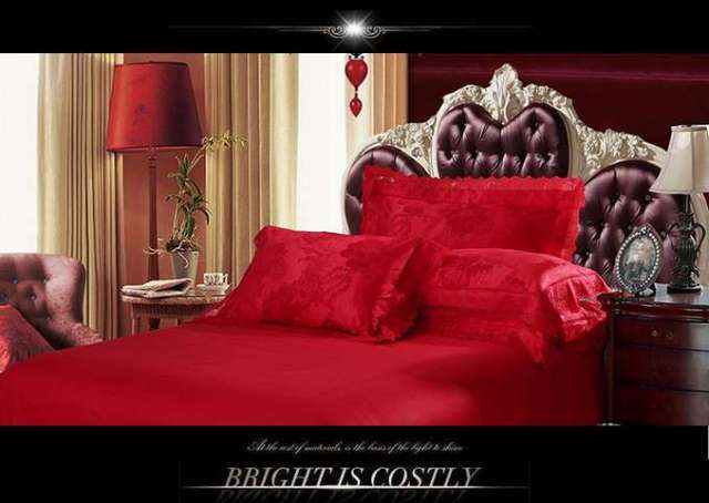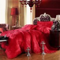 光沢のある綺麗なカラー。綺麗なレッドの素敵なジャガード織りです。カバーのエッジにレースをあしらった美しい仕上がりのセットです。