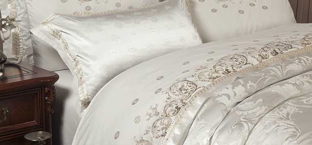 光沢のあるホワイトのジャガード織りです。センターを中心に大柄のダマスク模様が魅力的です。胸元の刺繍も特徴がございます。美しい仕上がりのセットです。