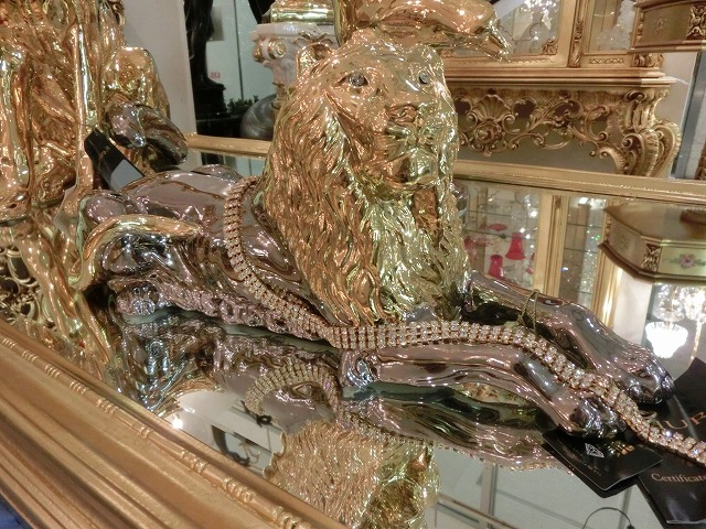 イタリア製 高級セラミック プラチナとゴールドが豪華なライオンです。 煌びやかなディティールにスワロフスキーのベルトを纏い、立派なお品になります。 サイズ 約W49cm D18cm H20cm になります。 こちらの商品は送料無料です。