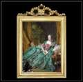 トップにモチーフの付いたアンティーク仕上げゴールドフレームポンパドール夫人の額絵。グリーンの綺麗なドレス。 ポリエステルキャンバスに印刷され紙質とは異なる仕上がりです。 表面にはアクリルがセットされます。 サイズ 約W37cm D2.6cm H55cm 背面にはヒモを利用して掛ける金具2か所付。 ミラーフレームを利用しております。背面縁にはタッカーを外す際にできます小キズ・欠け、背板にもタッカーの痕はご了承下さいませ。 受注生産のため2週間ほどお待ちいただきます。