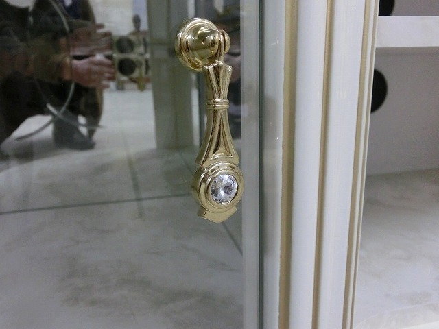 ライトグレーのストーン調のマテリアル。艶やかなコーティングに金箔風のゴールドライン。 両サイドのアールのきいたデザインがとても素敵なお品です。 ガラス面のカットガラスにくわえ、内部はミラーバック仕様ですので、コレクションが引き立ちます。 天板エッジのゴールドと大胆に加工が施されたベースが豪華な印象を与えてくれます。