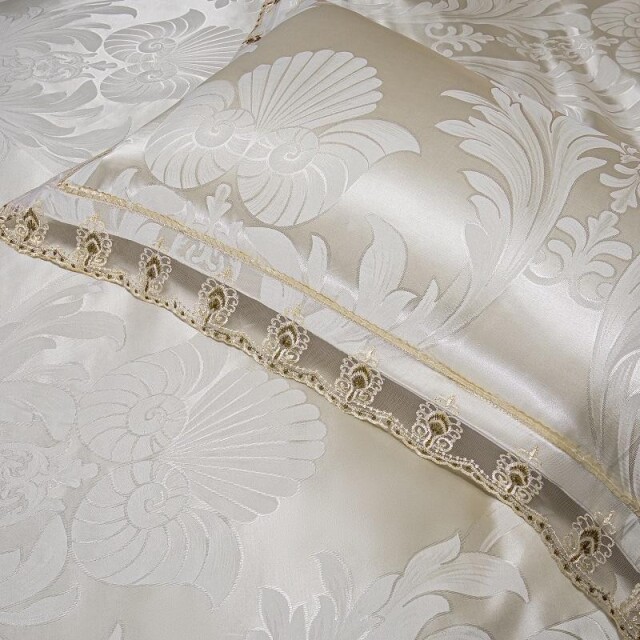 豪華な光沢のあるベージュ系カラー。大胆なジャガード織。カバーの表面はサテン生地。レースエッジがおしゃれなカバーセット。カバー裏面とシーツは綿素材です。美しい仕上がりのお品です。