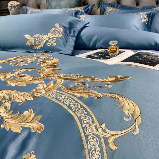 • 豪華刺繍 掛け布団カバー・シーツ・ピローケース×2 4Pセット m1-bl ブルー系 クイーン・キング 送料無料