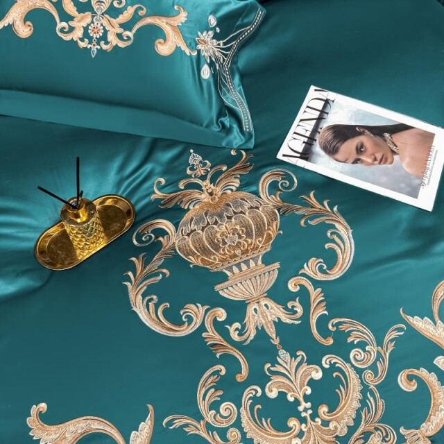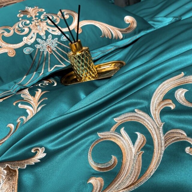 光沢のある上品カラー。ゴールド系の大胆な刺繍が素敵な寝具です。カバーの表面はサテン生地で裏面とシーツは綿素材。美しい仕上がりのセットです。