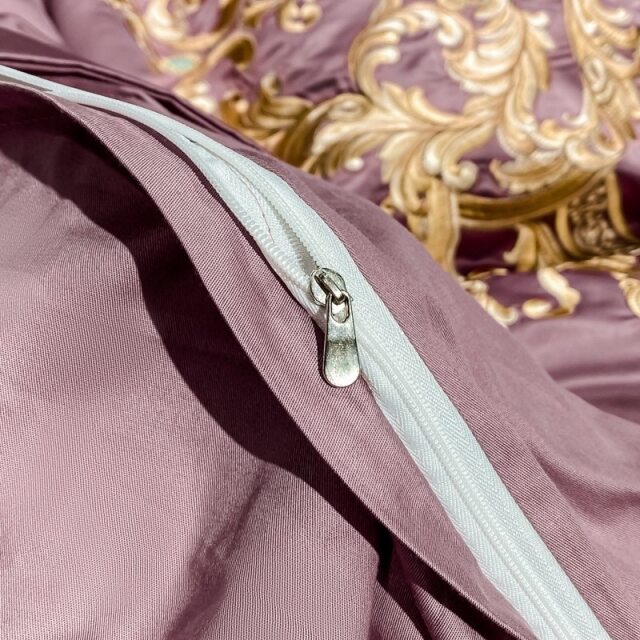 光沢のある上品なカラー。ゴールド系の大胆な刺繍が素敵な寝具です。カバーの表面はサテン生地で裏面とシーツは綿素材。美しい仕上がりのセットです。パープルがかったピンク系カラー