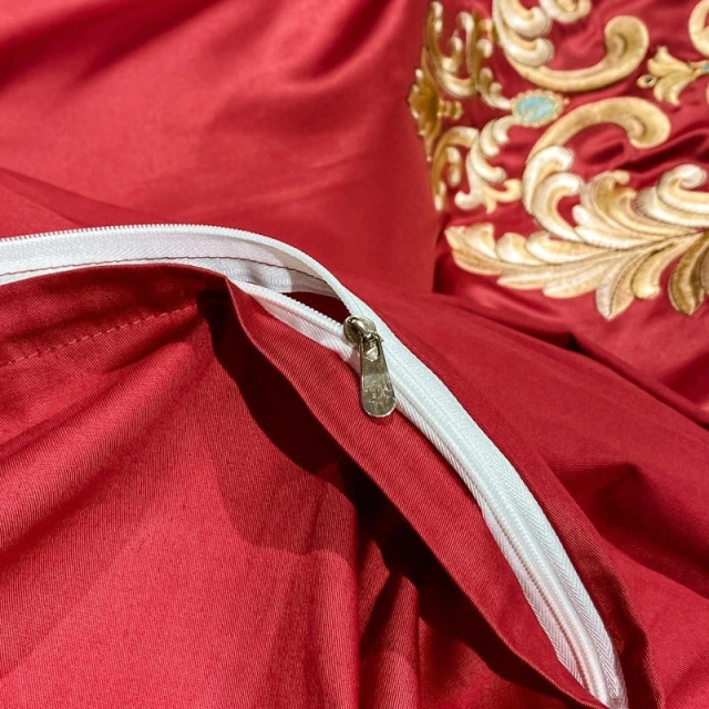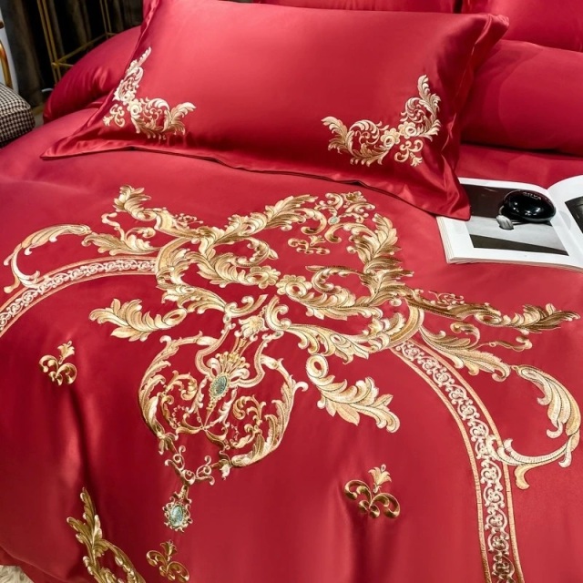 光沢のある上品なカラー。ゴールド系の大胆な刺繍が素敵な寝具です。カバーの表面はサテン生地で裏面とシーツは綿素材。美しい仕上がりのセットです。