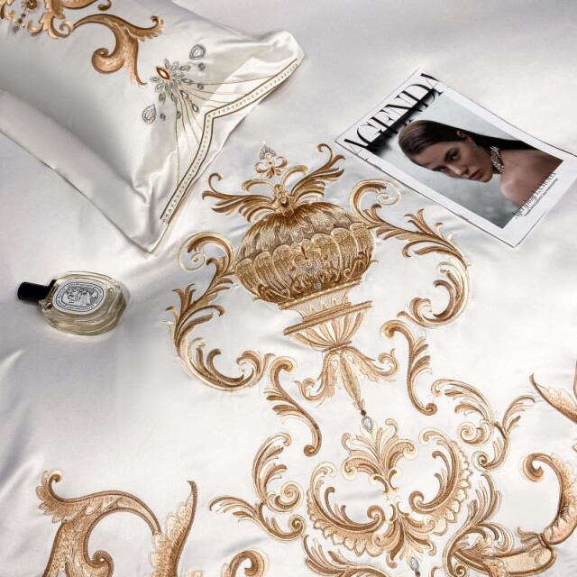 光沢のある上品なカラー。ゴールド系の大胆な刺繍が素敵な寝具です。カバーの表面はサテン生地で裏面とシーツは綿素材。美しい仕上がりのセットです。